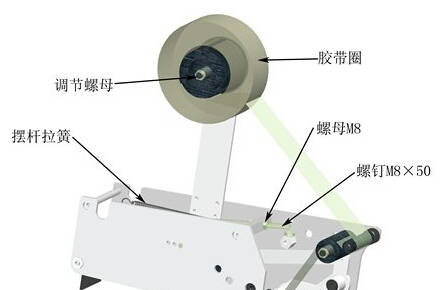 旋转旋钮,可以使胶带卷转速适中,并调松开螺母M8,调整螺钉M8×50的前后位置,改变摆杆长拉簧的弹力,从而控制胶带张力的大小。顺时针旋转旋钮,胶带张力变大,反之变小;螺钉M8×50向前调整,胶带张力变大,反之变小。
